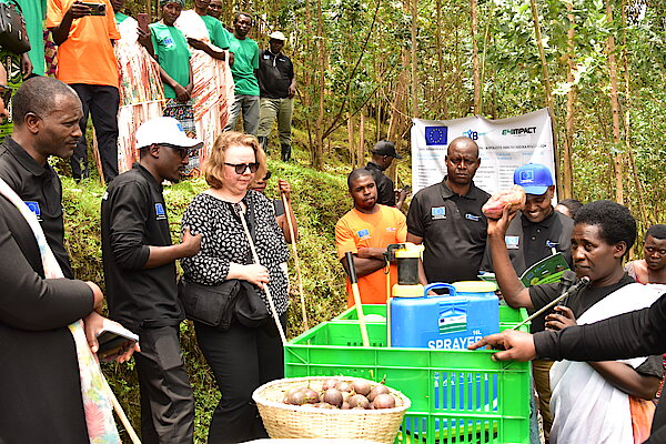 Itsinda ryasuye ibikorwa by’ubuhinzi biri mu Murenge wa Jomba, by’umushinga KUNGAHARA–FOSTERING, ufashwa n’Ubumwe bw’u Burayi (European Union in Rwanda) kandi ushyirwa mu bikorwa na FXB Rwanda ku bufatanye na E4Impact Rwanda.